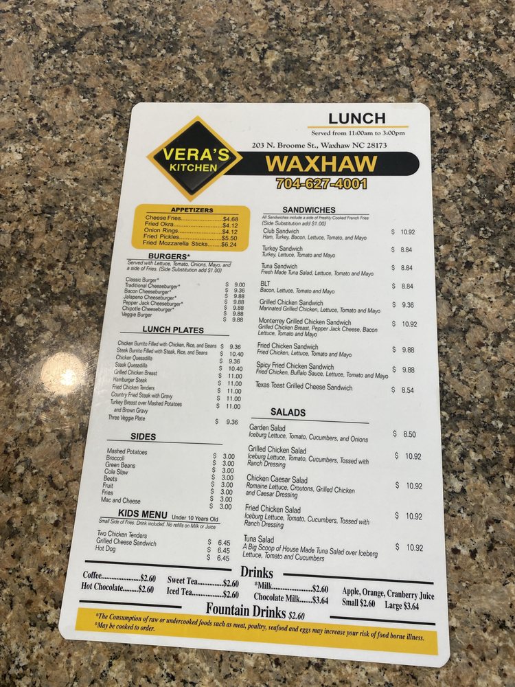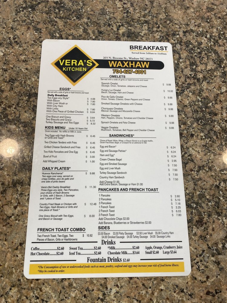 Located in downtown Waxhaw, NC, Vera’s Kitchen offers a cozy and welcoming atmosphere for breakfast and lunch. The menu features a mix of American and Mexican cuisine, with options ranging from hearty breakfast plates to classic burgers. Customers rave about the friendly service and delicious food, with highlights including crispy bacon, well-cooked meals, and a variety of tasty appetizers. The restaurant also provides various amenities such as free Wi-Fi, private dining, and outdoor seating. Reviews consistently mention the attentive staff and enjoyable dining experience, making Vera’s Kitchen a must-visit spot for a satisfying and affordable meal. From classic favorites like French toast to flavorful burgers, this family-owned restaurant has something for everyone to enjoy in a relaxed and inviting setting.